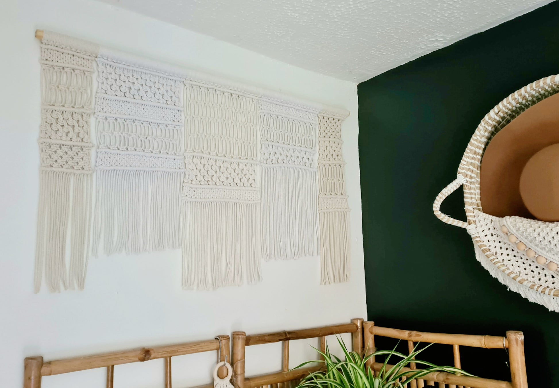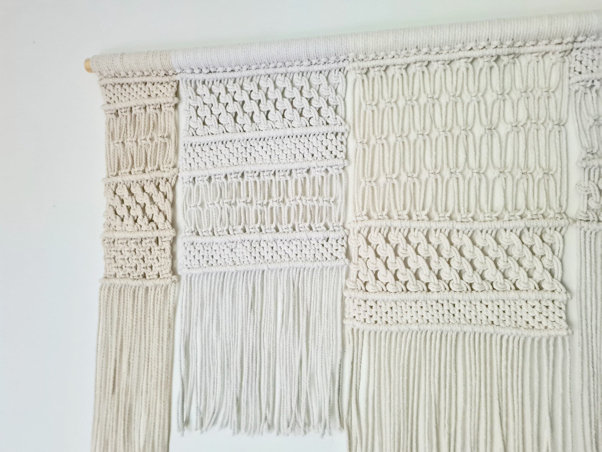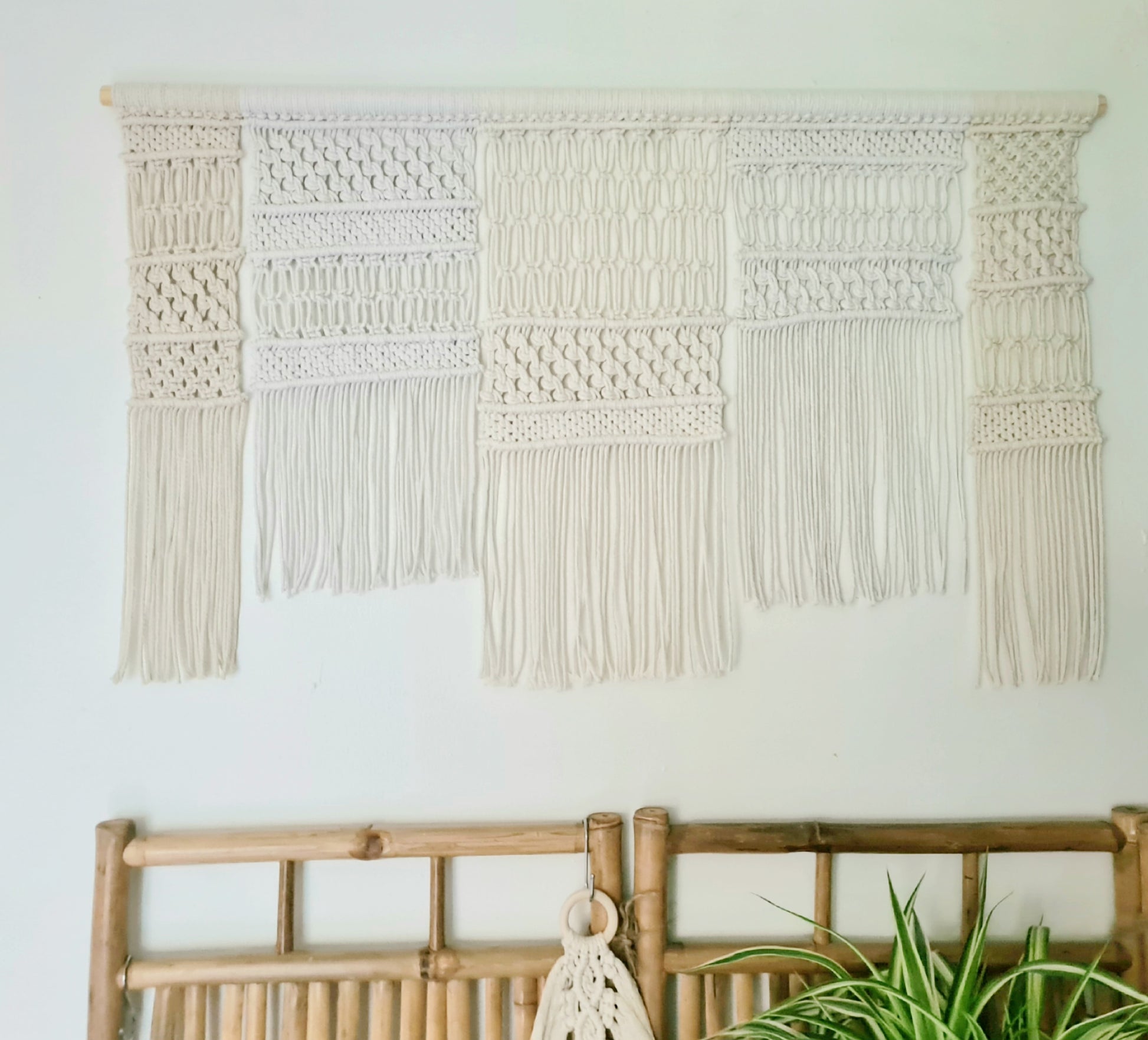 Woven in soft neutral shades from crisp white to warm ecru, this 5-panel macramé piece brings balance and texture to any room. Hung on a natural wooden dowel, it’s perfect as a stunning headboard display or a soulful statement on a large wall — inviting calm, creativity, and earthy elegance into your space