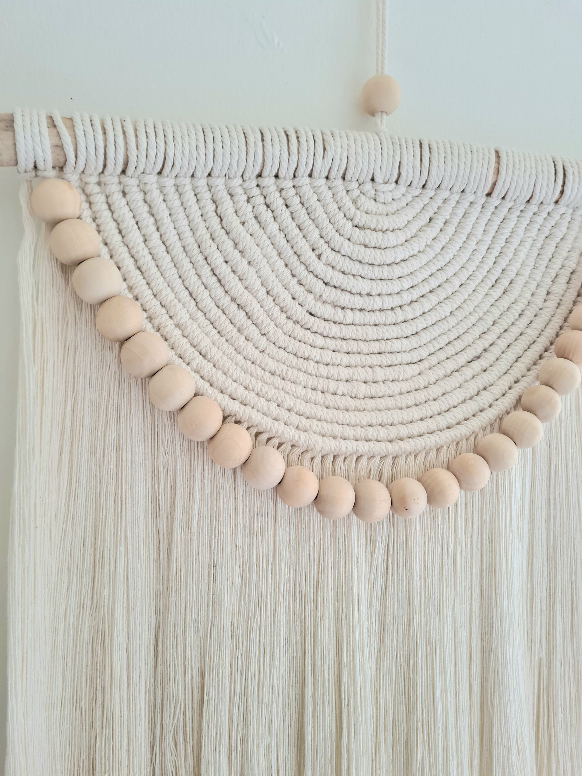 Flowing with natural texture and soft curves, this statement half-moon macramé piece is handcrafted on a smooth wooden branch. A perfect way to bring warmth, balance, and a touch of bohemian soul into any room.
