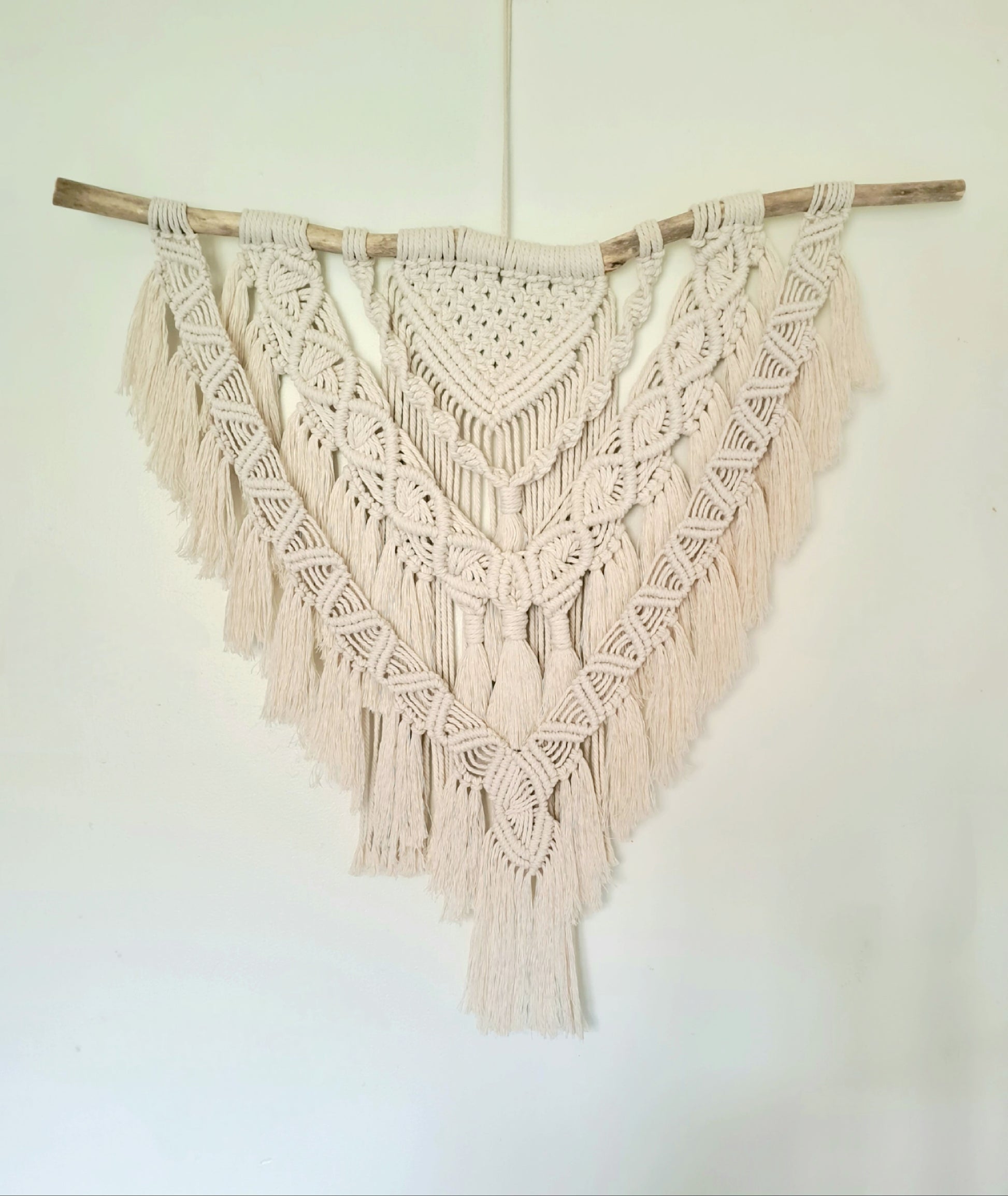 Rich in detail and crafted with patience, this large macrame wall hanging weaves together beauty and warmth. Its intricate patterns add a sense of depth and cosiness to any room, making it a true centrepiece