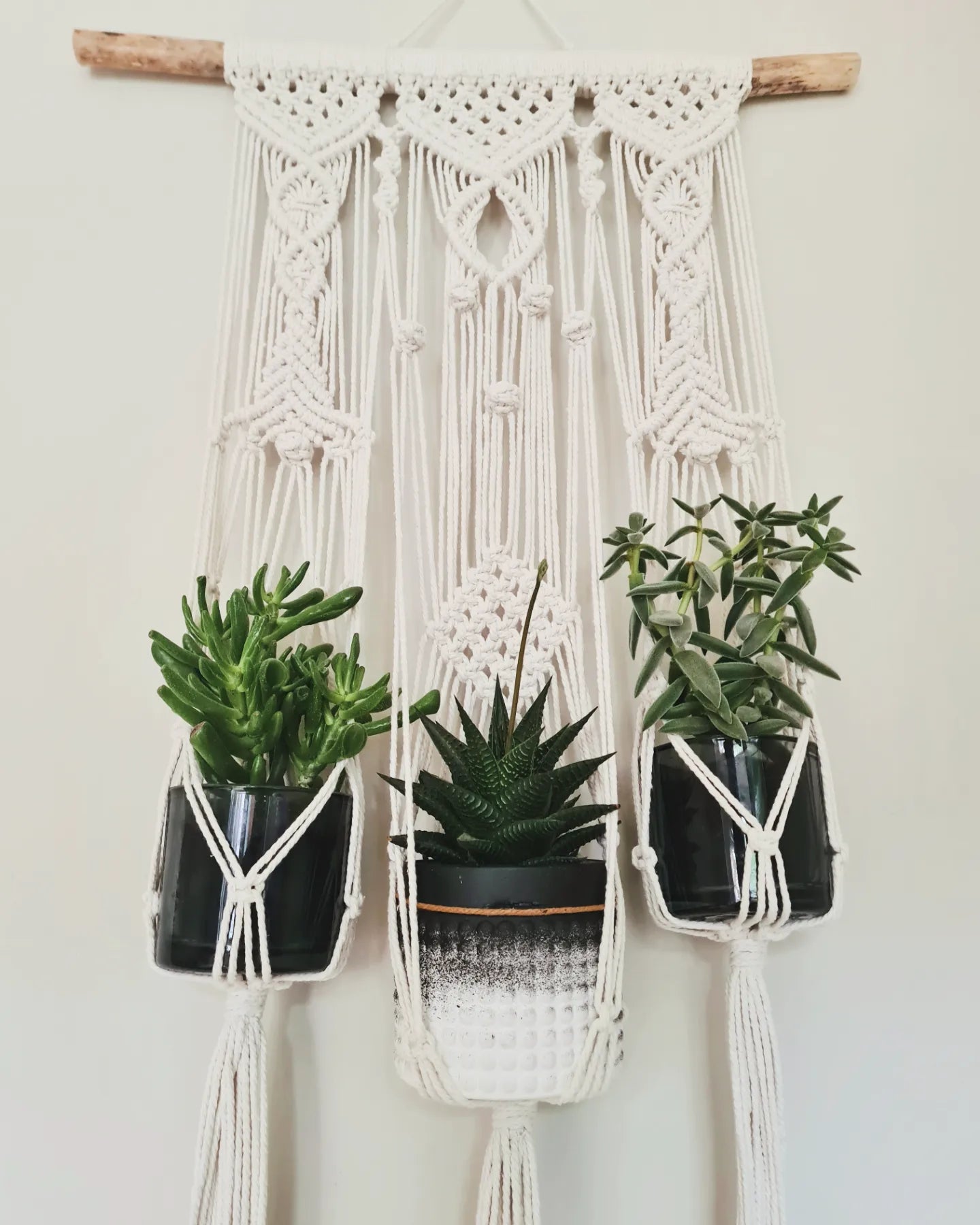 Make a bold botanical statement with this eye-catching triple macramé plant hanger, hand-knotted with love to create a stunning vertical garden display. Suspended from a natural wood, this piece features three tiers of intricate macramé work that cascade beautifully down your wall, each tier ready to cradle your favorite potted plants.